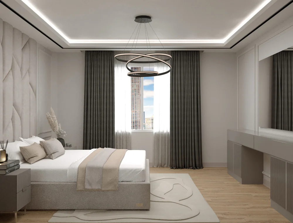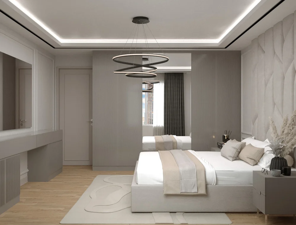 Projede sakin ve dingin bir atmosfer yaratmak için yumuşak tonlarda bir renk paleti kullanıldı. Doğal ışığı en iyi şekilde değerlendiren pencere düzeni, hem gün ışığından maksimum fayda sağlamayı hem de akşamları rahatlatıcı bir ortam sunmayı amaçladı. Özel tasarım yatak başlığı, gizli aydınlatma sistemleri ve işlevsel depolama alanlarıyla bu yatak odası, sadece estetik değil, aynı zamanda kullanışlı bir mekân olarak öne çıkıyor.