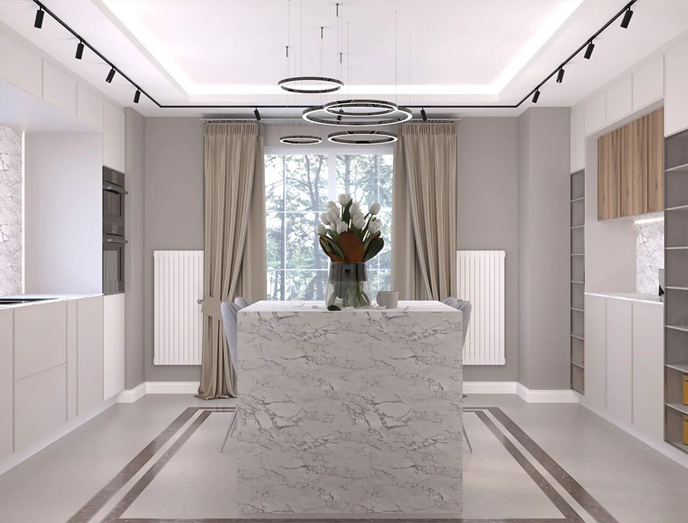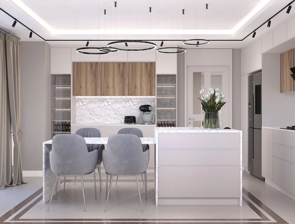 Mutfakta maksimum kullanım alanı sağlamak için akıllı depolama sistemleri, geniş tezgâh alanları ve fonksiyonel mutfak mobilyaları tercih ettik. Aydınlatmadan malzeme seçimine kadar her detayı titizlikle planlayarak hem şık hem de pratik bir ortam oluşturduk.