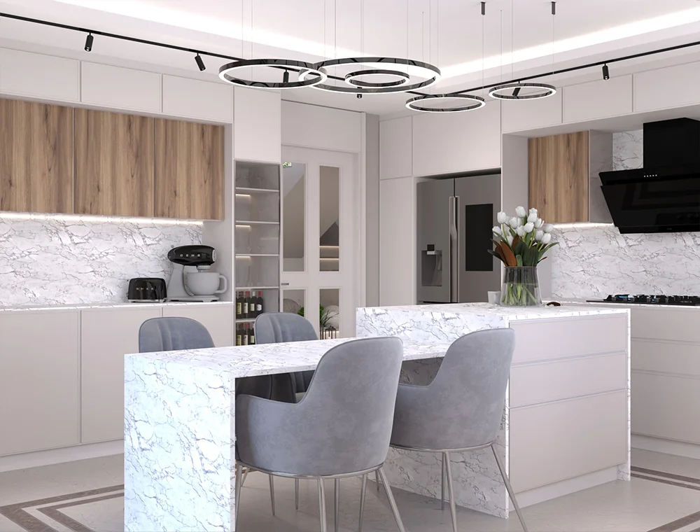 Mutfakta maksimum kullanım alanı sağlamak için akıllı depolama sistemleri, geniş tezgâh alanları ve fonksiyonel mutfak mobilyaları tercih ettik. Aydınlatmadan malzeme seçimine kadar her detayı titizlikle planlayarak hem şık hem de pratik bir ortam oluşturduk.